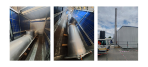 Une première tour de ventilation industrielle FSC classique (ø800mm), complétée par des éléments d’accès et d’exploitation intégrés dès l’origine, et raccordée à un ventilateur d’un débit de 23 000 m³/h.